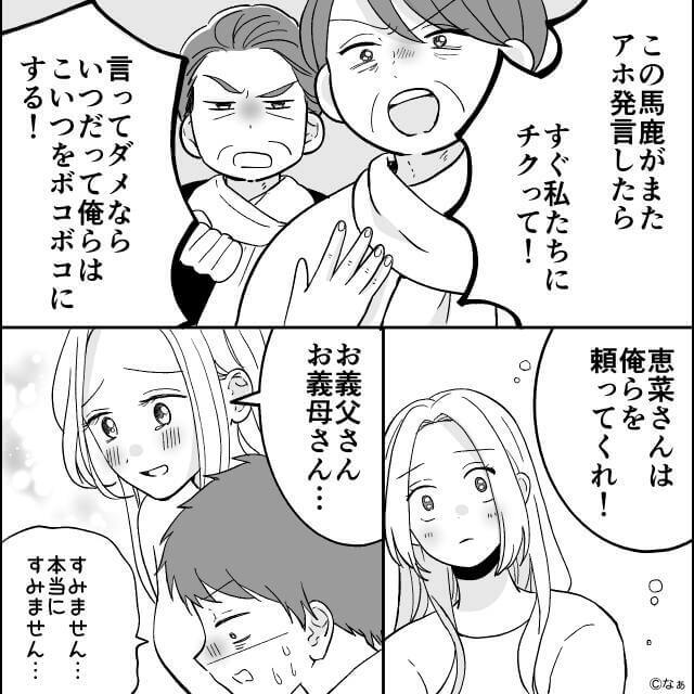 「そんな無神経だと捨てられるわよ!」と義母に怒られ、青ざめた夫は主人公に謝罪。 主人公は「こんなんで本当に大丈夫なのかな…」と不安になります。