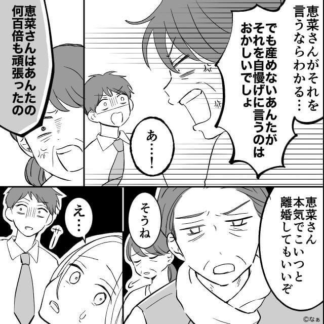 夫は助産師に説教されながら主人公をサポートし、主人公は無事に出産。 義両親が到着すると、夫は「俺もさーめっちゃ頑張ったよ。一緒に出産したって感じ!」と得意げな顔をします。