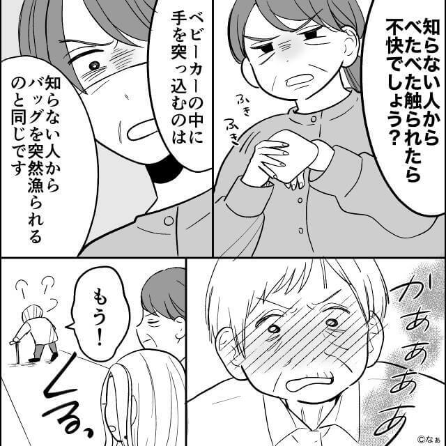 ある日、主人公が義母と娘と散歩をしていると、年配女性が「赤ちゃんかわいいわねぇ」と話しかけてきました。 年配女性が勝手に娘の顔を触ったため義母は怒りますが、年配女性は「少しくらいいいでしょ!」と話を聞きません。