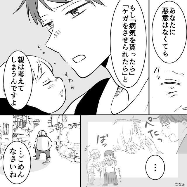 3日後、娘と出かけていた夫は年配女性と遭遇。 年配女性が娘に触ろうとしたため夫は避け「こんなの痴漢と一緒じゃないですか」と告げます。