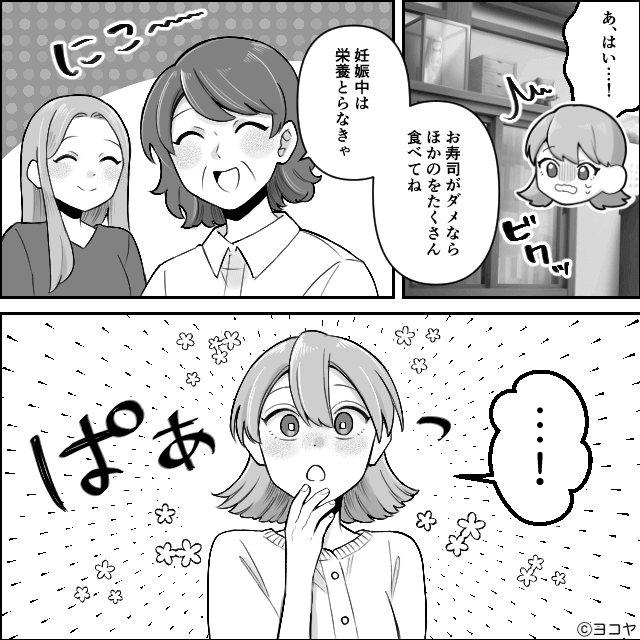 今回は『“うっかり”が口癖の確信犯義母』を紹介します。 お寿司を用意し「妊娠中だから生ものダメだったわね」とわざとらしく謝った義母。 その態度に、主人公は「絶対わざとだ…」と感じたのでした。