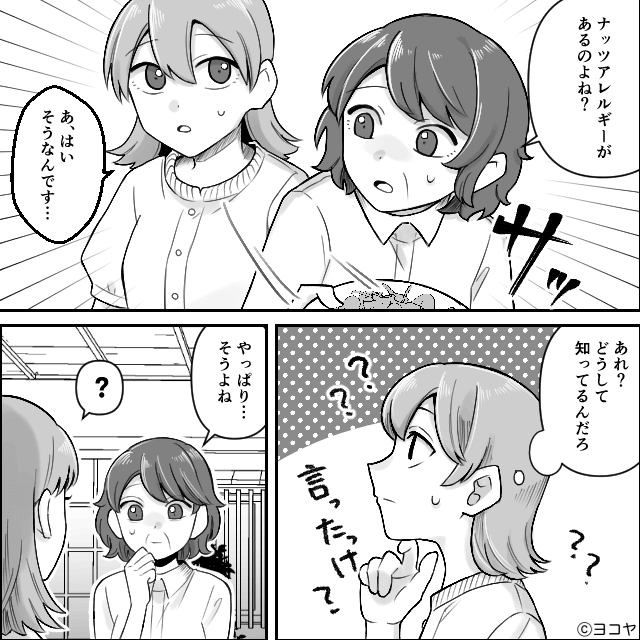 親戚たちに「他のをたくさん食べてね」と優しく声をかけられた主人公はサラダを手に取りますが、そこにはナッツが入っていました。 実は親戚は主人公のアレルギーを知り、料理中の義母にナッツを入れないよう声をかけていたのです。