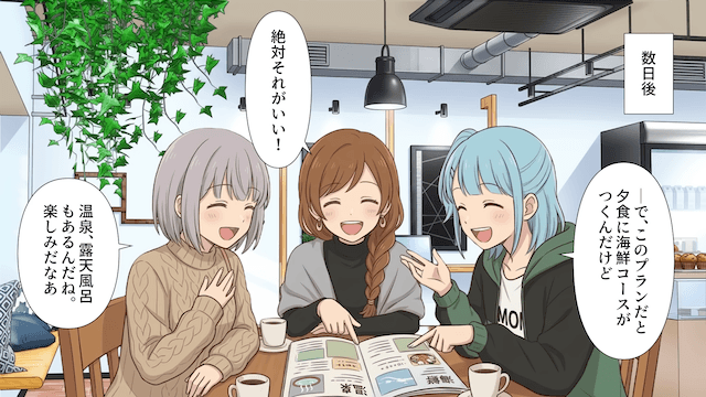 今回は『女子会旅行なのに…友人「家族も連れてきた♪」私たち「は?」』を紹介します。 社割が使えるリゾートホテルを見つけ、親友たちを旅行に誘った主人公。 そして週末、カフェに集まって旅行の詳細を決めることにしたのですが…。
