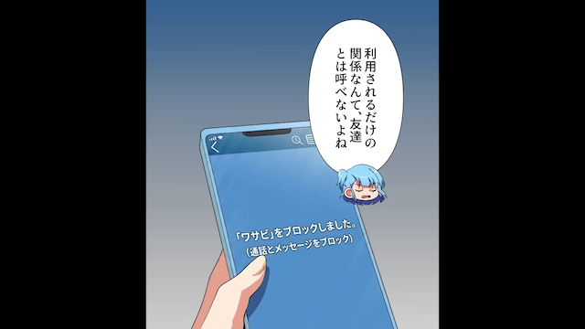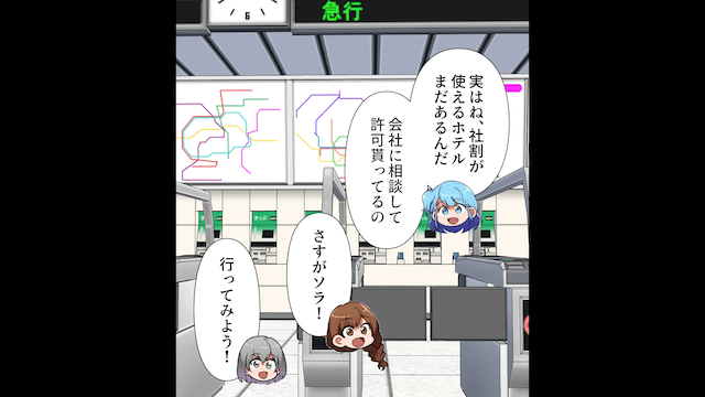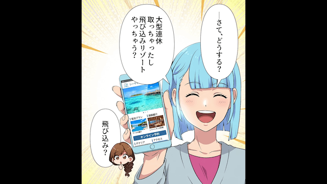 友人家族がリゾートホテルに向かったあと、主人公は呆れながら「私がいないと社割にならないのに」と言い、友人の連絡先をブロックしました。 そして主人公は社割が使える他のリゾートホテルを親友たちに提案したのです。
