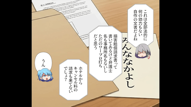 最高の旅行をした数日後、友人から主人公のもとに封筒が届きました。 友人は宿泊費が通常料金であることを通知しなかったのは詐欺行為だと主張し、慰謝料を請求してきたのです。