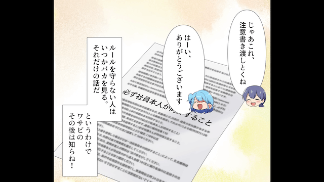 再び友人から封筒が届いたものの、それを無視し、親友たちを旅行に誘った主人公。 そして主人公が会社からもらった注意書きには「必ず社員本人が同行すること」と書かれていたのでした。