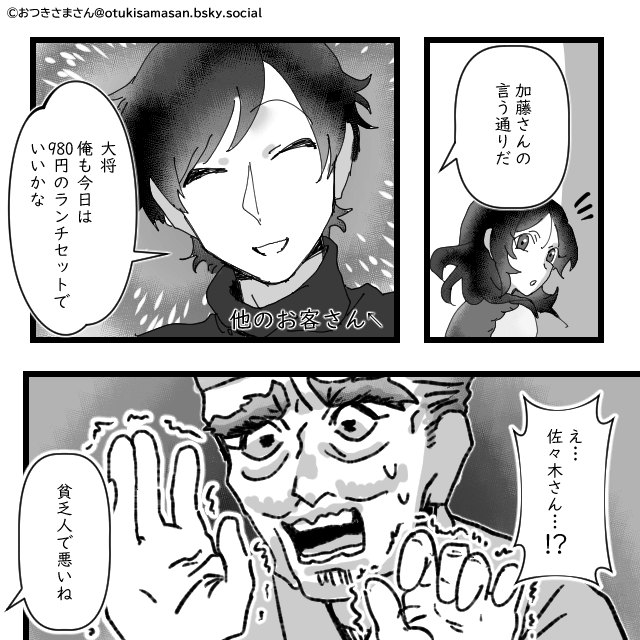 常連客が大将の傲慢な態度を怒ると、大将は「この女は態度が気に食わなかっただけで…」と主人公のせいにして言い訳をしました。 しかし他の客も常連客の意見に同意し、主人公を庇ってくれて…。