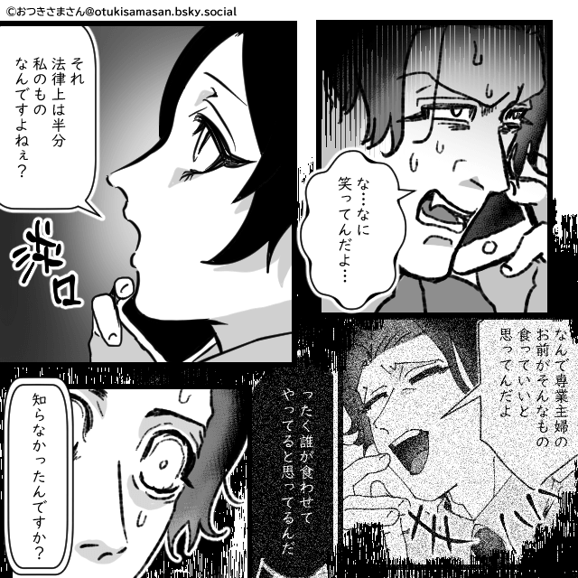 荷物がないことに気づいた夫は激怒し、主人公に電話をかけてきました。 そして夫が「俺の金で暮らしてきたくせに」とモラハラ発言をするため、主人公は「法律上は半分私のものなんですよねぇ」と答え…。