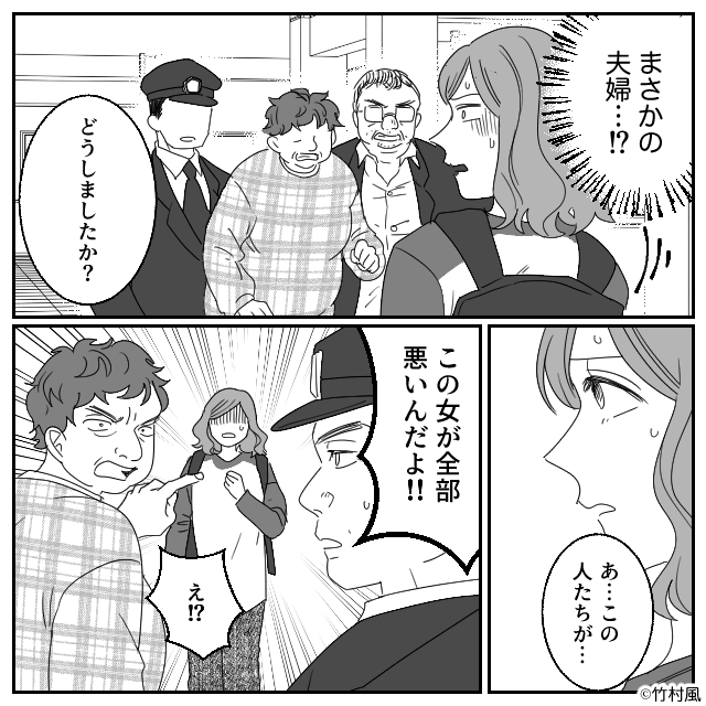 降りる改札を間違え、道に迷っていた主人公。 すると実は夫婦だった男性と女性がやってきて、主人公を責めてきます。