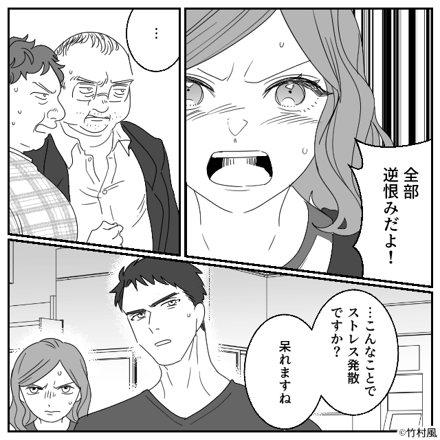 彼氏が男性を睨むと、男性は焦って「道を聞いてただけで…」と嘘をつきました。 しかし主人公は「違う!」と2人の悪事を暴露。