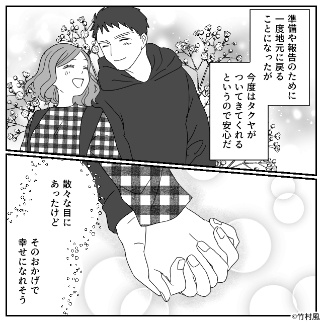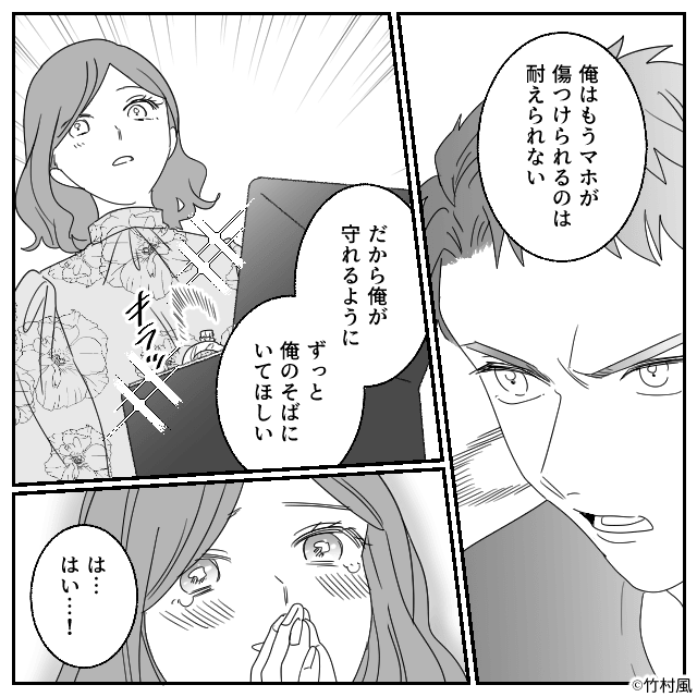 男性と女性は警察に連れていかれ、その後、悪事を働いていたときの動画がSNSで拡散されて引きこもり状態になります。 一方、主人公は「俺が守れるようにずっと俺のそばにいてほしい」と彼氏からプロポーズされたのでした。