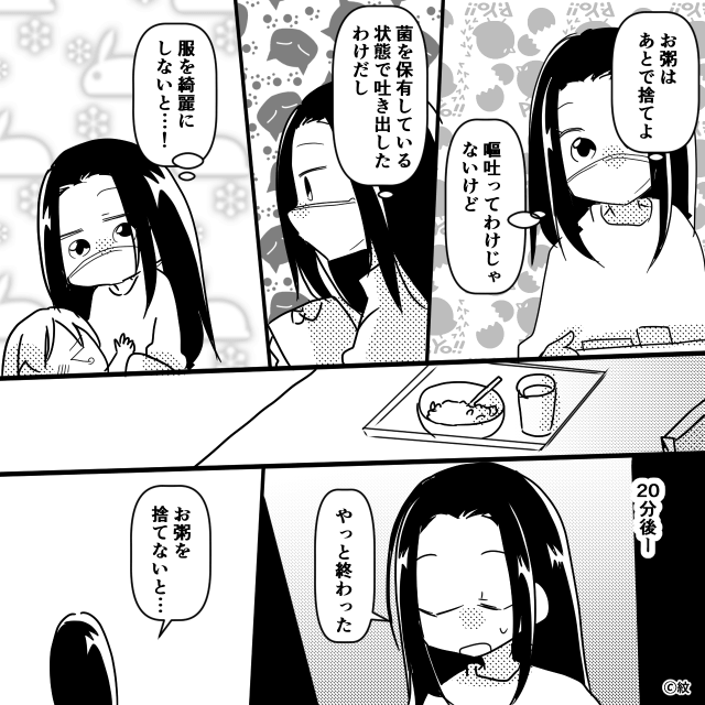 娘がインフルエンザになり、夫とは別室で過ごすことになります。 3日後、主人公は少し食欲が戻った娘にお粥を食べさせましたが、娘はすぐにいらないと言いました。