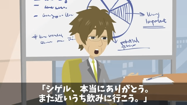 女性社員たちの態度を見て、後輩は「本当にいい加減に…」と怒ろうとしました。 主人公はそんな後輩に「本当にありがとう。また近いうちに飲みに行こう」と言い、会社を後にして…。