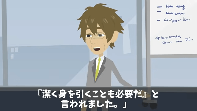 今回は『社長令嬢「おじさん新人は使えないから出ていけ(笑)」俺「いいのね?」速攻、退職願を出した結果』を紹介します。 女性社員は主人公が自分から辞めたいと言ったのだと社長に説明しました。 そして男性社員も、主人公の意志が固かったからその決断を尊重したと社長に伝えたのですが…。
