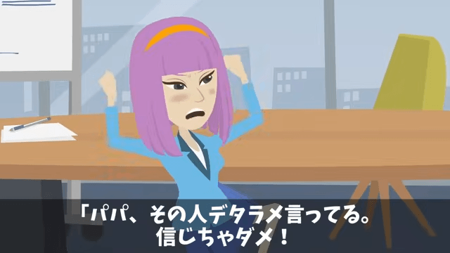 主人公は男性社員たちから言われた内容を社長に伝えました。 すると女性社員が「パパ、その人デタラメ言ってる。信じちゃダメ!」と言い…。
