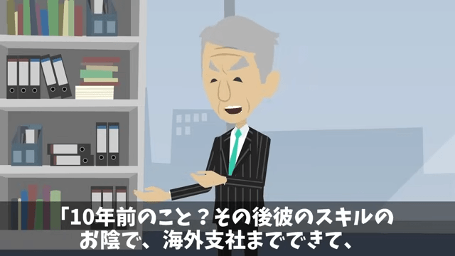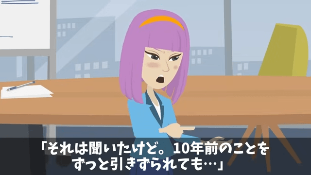 社長は主人公が10年前に会社を救ってくれた恩人であることを女性社員たちに説明しました。 そこで女性社員は「それは聞いたけど。10年前のことをずっと引きずられても…」と言い返したのですが…。