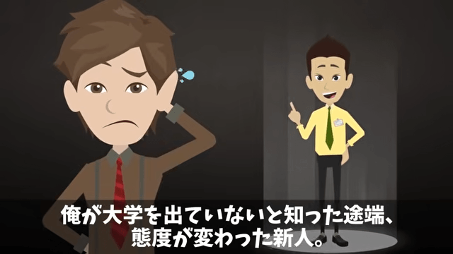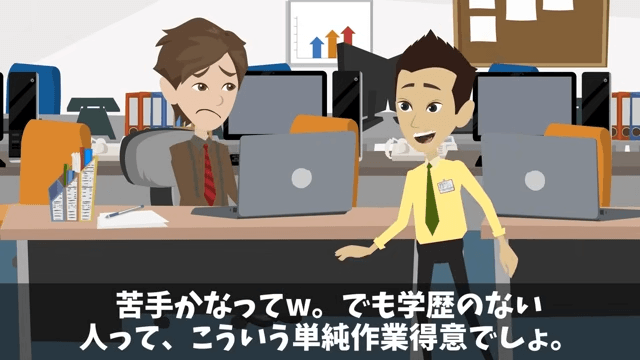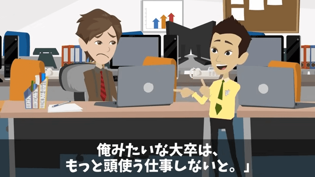 部下は、学歴がない主人公は単純作業が得意なはずだと言いました。 さらに部下は「俺みたいな大卒は、もっと頭使う仕事しないと」と得意げに言ったのです。
