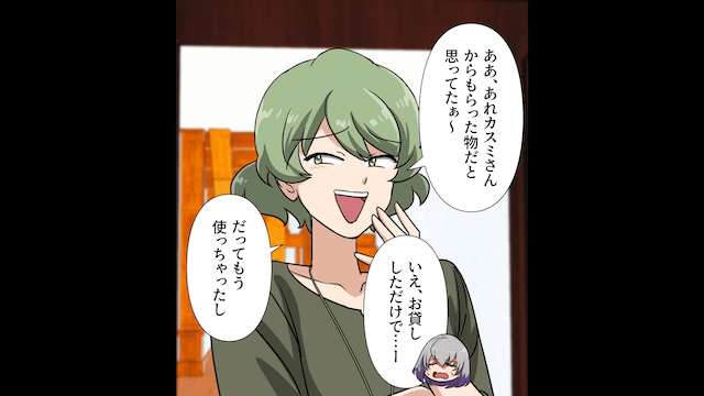友人と話していた主人公は、店員に万引きを注意されている隣人を見かけ、不信感を抱きました。 そして後日、主人公が隣人宅を訪れて貸したものの返却を求めると、隣人は「もらったものだと思ってたぁ」と言い、隣人の夫も「勘違いじゃないのか?」と言ってきて…。