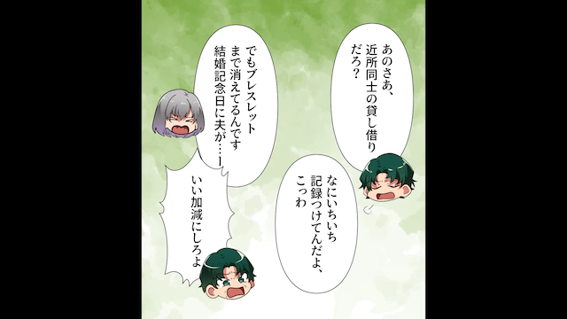 今回は『借りパクする隣人が「ウチのものだと思ってた~(笑)」というので社会的に成敗した結果』を紹介します。 夫から結婚記念日にもらったブレスレットがなくなり、隣人を疑う主人公。 そこで主人公はなくなったもののリストを作り、隣人宅を訪ねることにしたのでした。