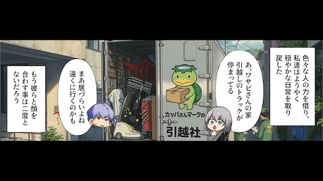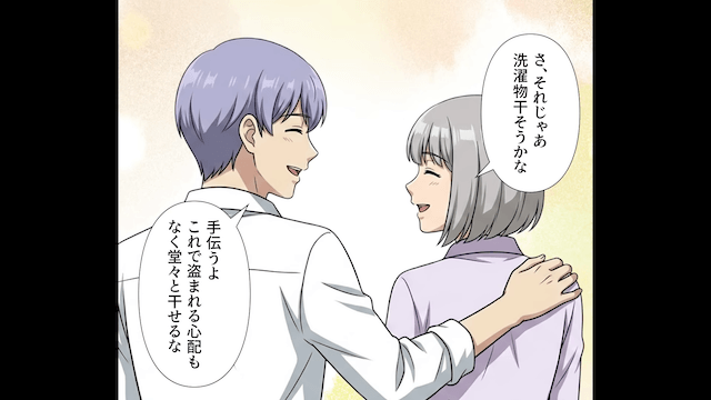 逮捕令状が出た隣人は逮捕され、隣人の夫は引きこもって生活が荒れ狂いました。 そして穏やかな日々を取り戻した主人公は、協力してくれた友人に感謝し、堂々と洗濯物を干せるようになったことを喜んだのでした。