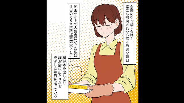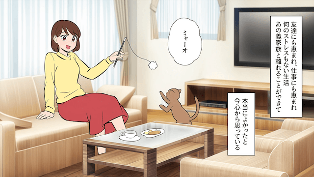 一方、引越しをして自由な暮らしを得た主人公は、ストレスのない充実した日々を過ごすのでした。