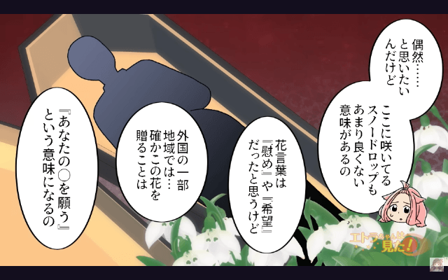 ママ友は黒い百合には「呪い」「復讐」という花言葉があり、あまり人に贈る花ではないのだと主人公に話してきました。 さらにスノードロップも、海外の一部の地域で、相手の不幸を願って贈る花とされているようで…。