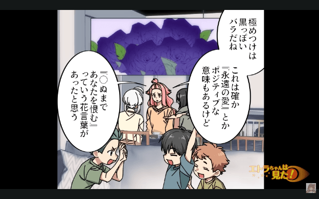 今回は『花屋からもらった花束の意味が衝撃的だった話』を紹介します。 ママ友は黒い百合には「呪い」「復讐」という花言葉があり、あまり人に贈る花ではないのだと話してきました。 それを聞いた主人公は単なる偶然ではないかと考えますが、ママ友はスノードロップも相手の不幸を願って贈る花とされていることを話してきて…。