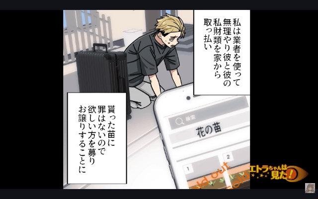 今回は『花屋からもらった花束の意味が衝撃的だった話』を紹介します。 夫を手に入れるため、主人公の不幸を願い、花を贈ってきた女性。 そして花言葉の意味など知らなかった夫は主人公との離婚を拒んだのですが、主人公はその場で夫との離婚を宣言したのです。 主人公が家から出て行くよう夫に言ってその場を去ると、女性は大喜びして…。