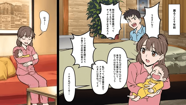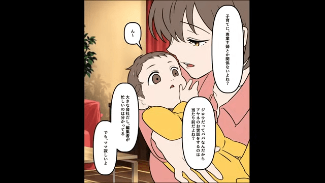 今回は『子育てする妻を見下した夫の末路』を紹介します。 夫は「家事なんて仕事と比べたら遊びみたいなもんだよ」と笑い、専業主婦の主人公を見下していました。 さらに夫が「誰のおかげでメシが食えると思ってんだか」と言うと、主人公は夫に立場を交換しようと提案して…。