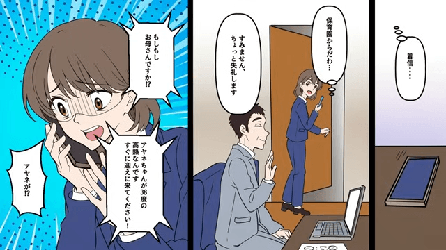 そんなある日、大事な商談中に保育園から呼び出された主人公は、夫に娘のお迎えを頼んだのですが…。