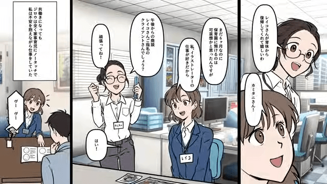 出産後、家事や子育てに非協力的な夫に悩んでいた主人公。 主人公が復職してからも夫の態度は変わらず、主人公は不安を抱えながら仕事をしていました。