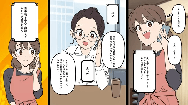 夫が娘のお迎えに行かなかったため、主人公は保育士に叱られ、娘のためにも仕事を辞める決断をしました。 それから数年が経ち、上司から「そろそろ在宅勤務くらいならできるんじゃないかしら?」と言われた主人公は、そのことを夫に相談するのですが、大反対されてしまい…。