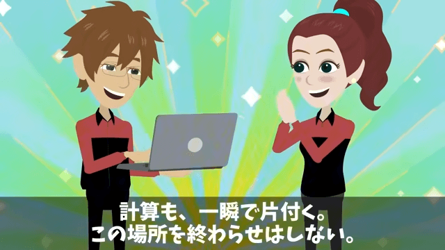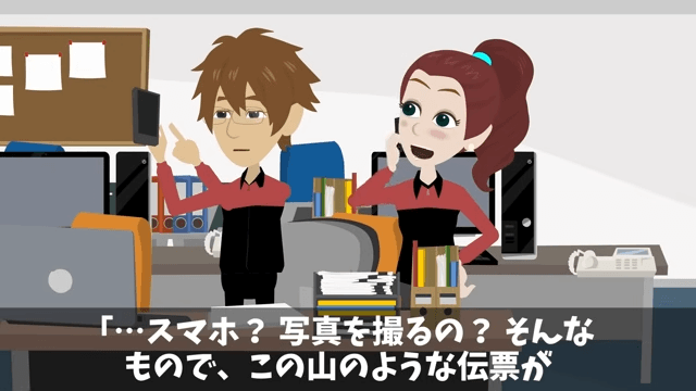 主人公は自分が作ったシステムなら膨大な計算も一瞬で片づくと女性社員に言いました。 そして主人公はスマホで伝票の写真を撮り始めたのです。
