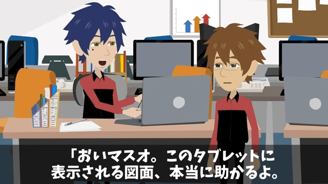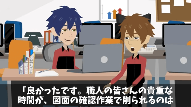 主人公が導入した管理システムにより、現場の空気は劇的に変わっていました。 そして男性作業員は「このタブレットに表示される図面、本当に助かるよ」と主人公に言ったのです。