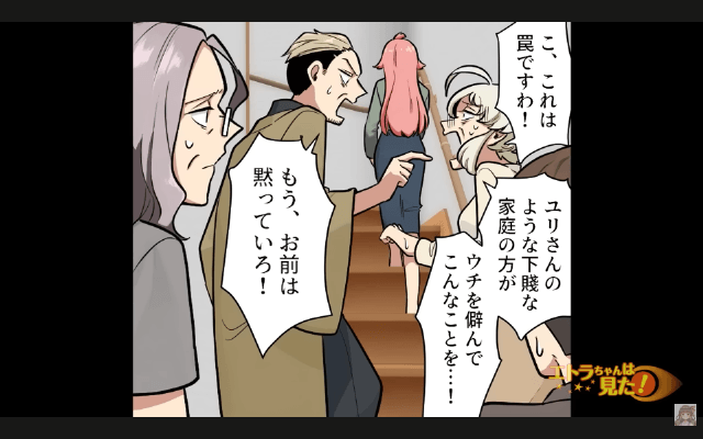 紛失防止タグの音が鳴り響くと、主人公と男性はその音が聞こえる方へ向かいました。 そしてその間、町内会長は「これは罠ですわ!」「彼女のような下賤な家庭の方が、ウチを僻んでこんなことを…!」と主人公の悪口を言っていたのです。