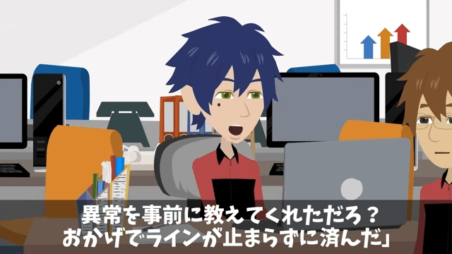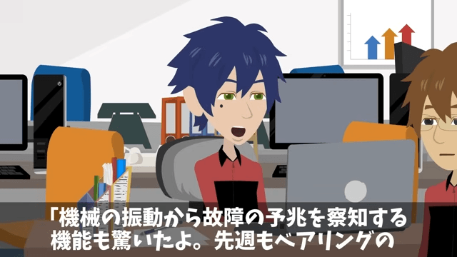 男性作業員は故障の予兆を察知する機能のおかげで、ラインが止まらずに済んだと言いました。 主人公はそんな男性作業員に「突発的な故障による稼働停止は、孫請け工場にとって大きな痛手になりますから」と話して…。