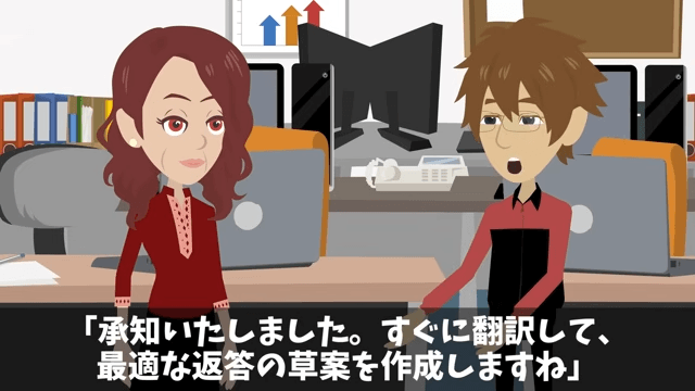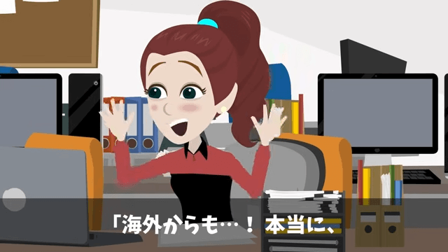 女性作業員は海外のメーカーから提携の相談メールが来ていることを主人公に報告しました。 それを聞いた女性社員は「海外からも…!本当に、夢を見ているみたい」と喜んで…。