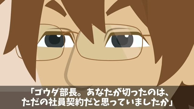 部長は「俺が間違っていた。今すぐ本社に戻って、ロックを解いてほしい」と主人公に言いました。 すると主人公は「あなたが切ったのは、ただの社員契約だと思っていましたか」と部長に尋ねて…。