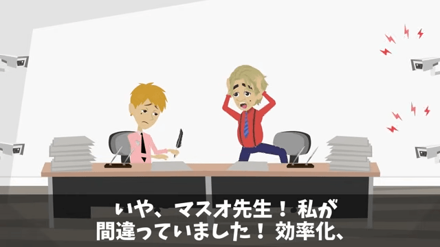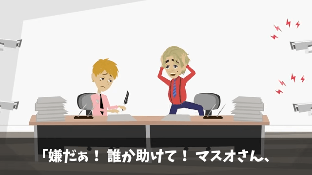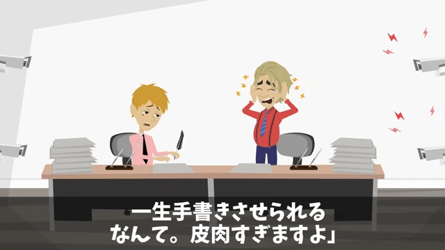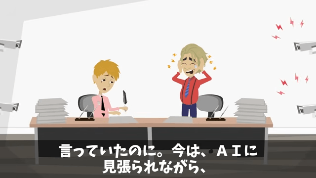 係長は「AIに見張られながら、一生手書きさせられるなんて。皮肉すぎますよ」とつぶやきました。 すると部長が「嫌だぁ!誰か助けて!」と助けを求めて…。