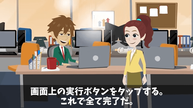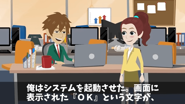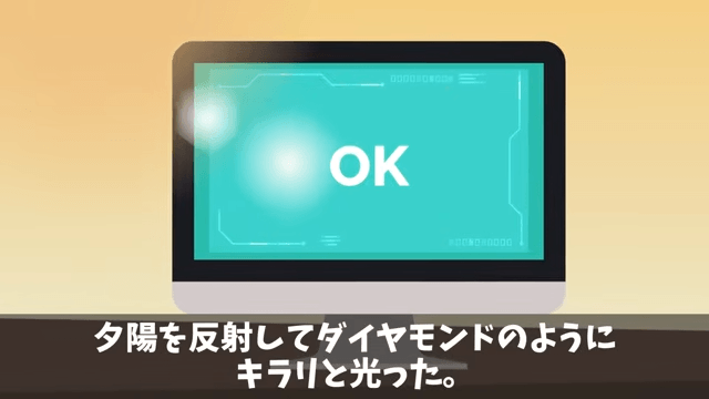 主人公は女性社員に「さあ、最後の処理を終わらせてしまいましょう」と言いました。 するとそのとき、画面に表示された「OK」という文字が、夕陽を反射してダイヤモンドのように光ったのでした。