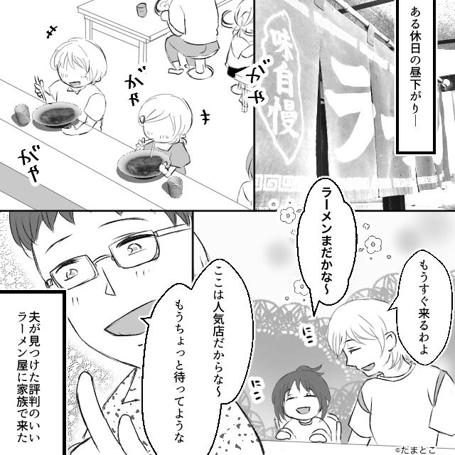 今回は『ラーメン屋で遭遇したカスハラ客の末路』を紹介します。 ある休日の昼下がり、主人公家族は評判のいいラーメン屋にやってきました。 ラーメンが届くのを楽しみにしていると、近くの席で男性客の怒鳴り声が聞こえ…。
