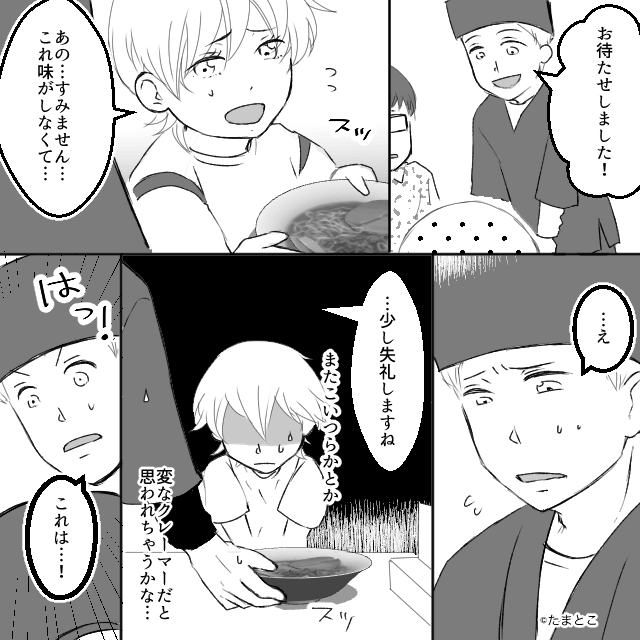 今回は『ラーメン屋で遭遇したカスハラ客の末路』を紹介します。 ラーメンのスープに味がついていないことに気づき、困惑する主人公。 夫も困惑し、すぐに店員を呼んでくれて…。