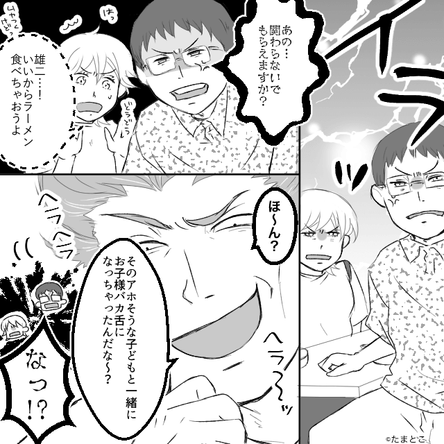 主人公が店員に事情を説明すると、タレの入れ忘れだったようで、店員は謝罪をしてくれました。 しかしその様子を見ていた男性客が「俺のことは非難して自分はクレームか?」と再び絡んできて…。
