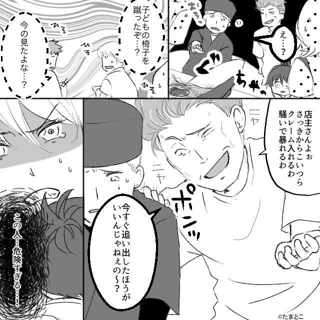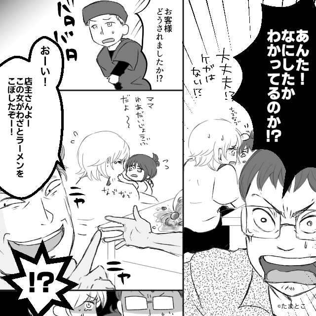 男性客の発言に夫が激怒していると、男性客はわざと娘のイスを蹴りました。 娘が倒れそうになったため主人公が慌てて助けると、その拍子にラーメンがこぼれてしまいます。