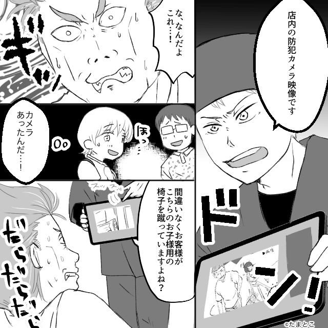 今回は『ラーメン屋で遭遇したカスハラ客の末路』を紹介します。 男性客が娘のイスを蹴ったことを、店員に伝えた主人公。 事情を知った店員は、店の奥に入っていき…。