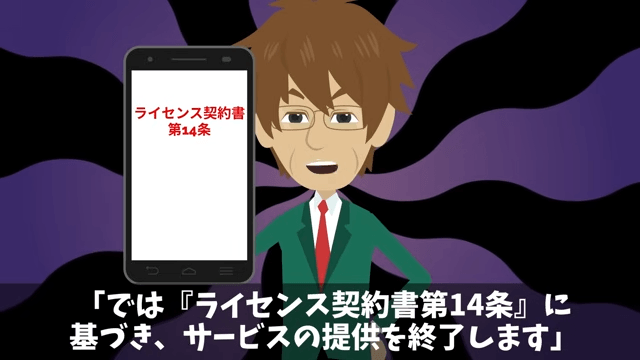 主人公は社長に忠告をしましたが、社長は聞く耳を持ちませんでした。 そこで主人公は「ライセンス契約書第14条に基づき、サービスの提供を終了します」と社長に告げたのです。