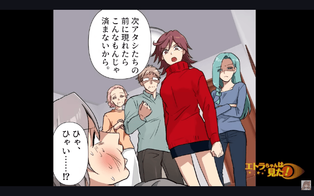 両親は姉が実家に帰ってきた理由や、主人公がもてあそばれたことを知り、彼氏に激怒しました。 そして主人公は彼氏に威嚇をすると「次アタシたちの前に現れたらこんなもんじゃ済まないから」と言ったのです。