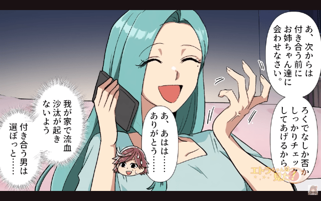 彼氏は逮捕され、姉は過剰防衛に問われたものの罰は免除されることに。 そして姉は主人公に「次からは付き合う前にお姉ちゃんたちに会わせなさい」「ろくでなしか否かしっかりチェックしてあげるから」と言ってきたのです。