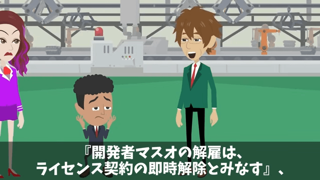 役員たちが主人公にまつわる逸話を話し始めると、主人公は「私はただ、自分が作ったものを管理しているだけです」と言いました。 そして主人公は社長に、自分を解雇した場合、ライセンス契約が即時解除になることを説明して…。
