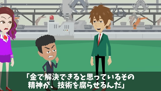 主人公は、お金で解決できると思っている精神が技術を腐らせるのだと社長に言いました。 すると社長は「うるせえ!きれいごと言ってんじゃねえ!どうせ金目当てだろ!」と言い返して…。
